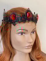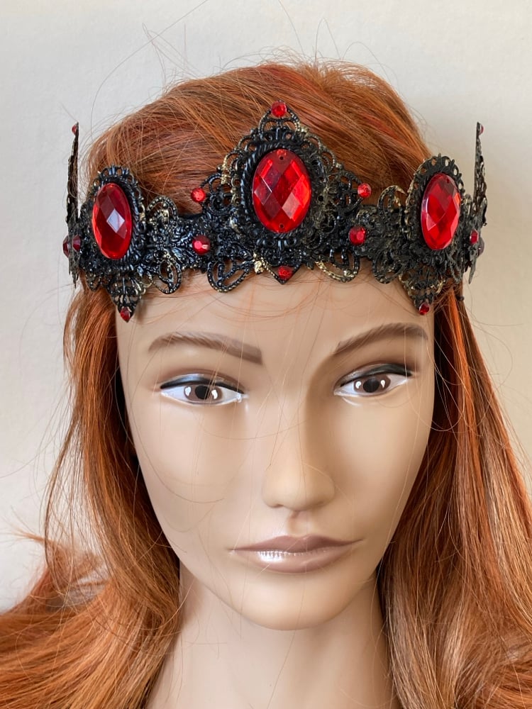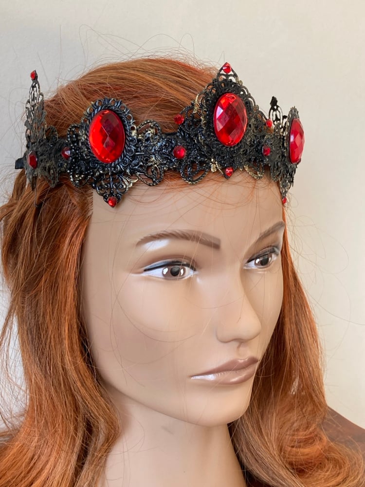 Looking for a crown that makes more of a statement? Our Ethana crown can be found here in the Court of Shadows as a sumptuous black and red crown with a smudge of gold, but a lighter version also resides over in our Court of Light.