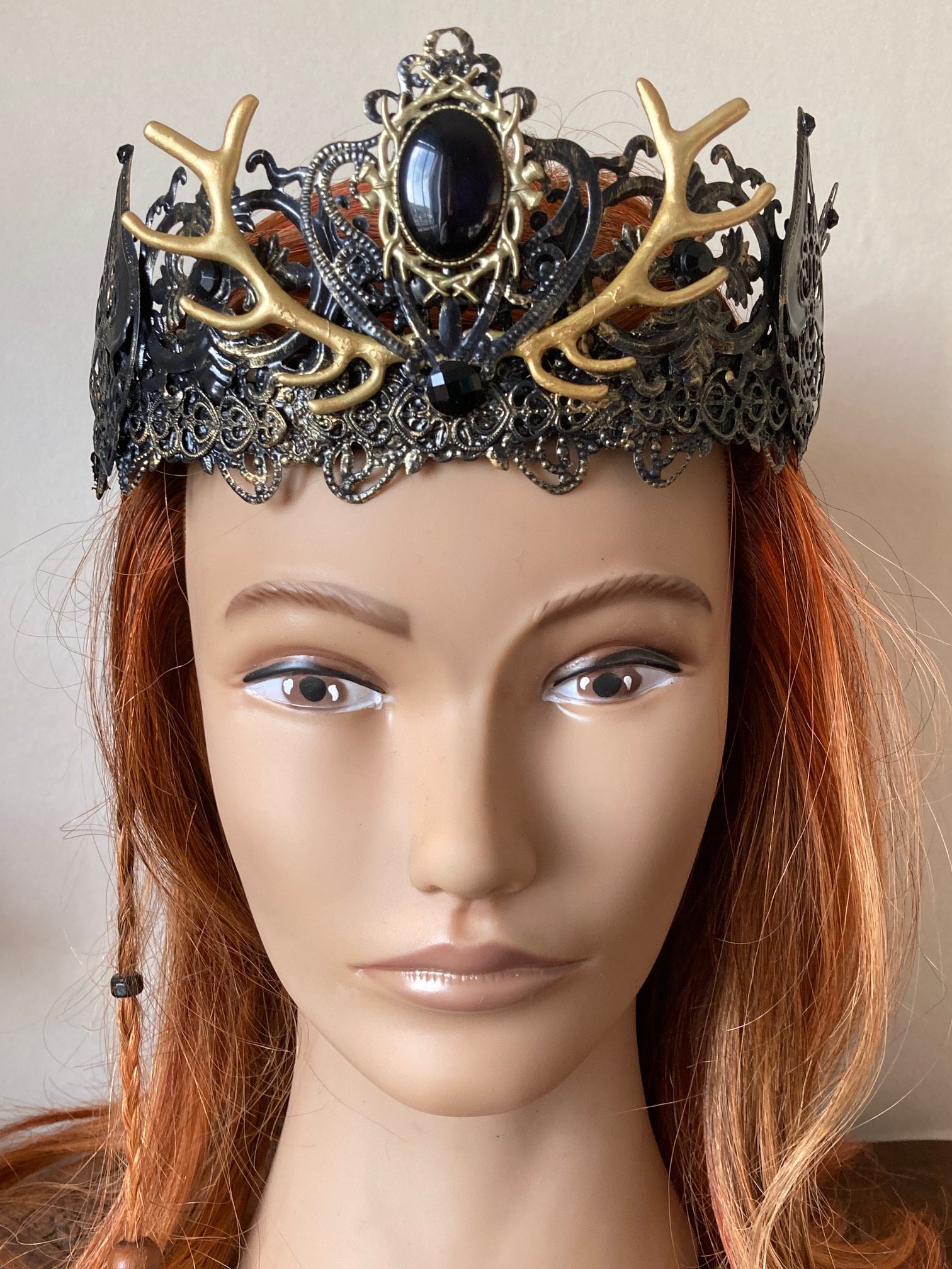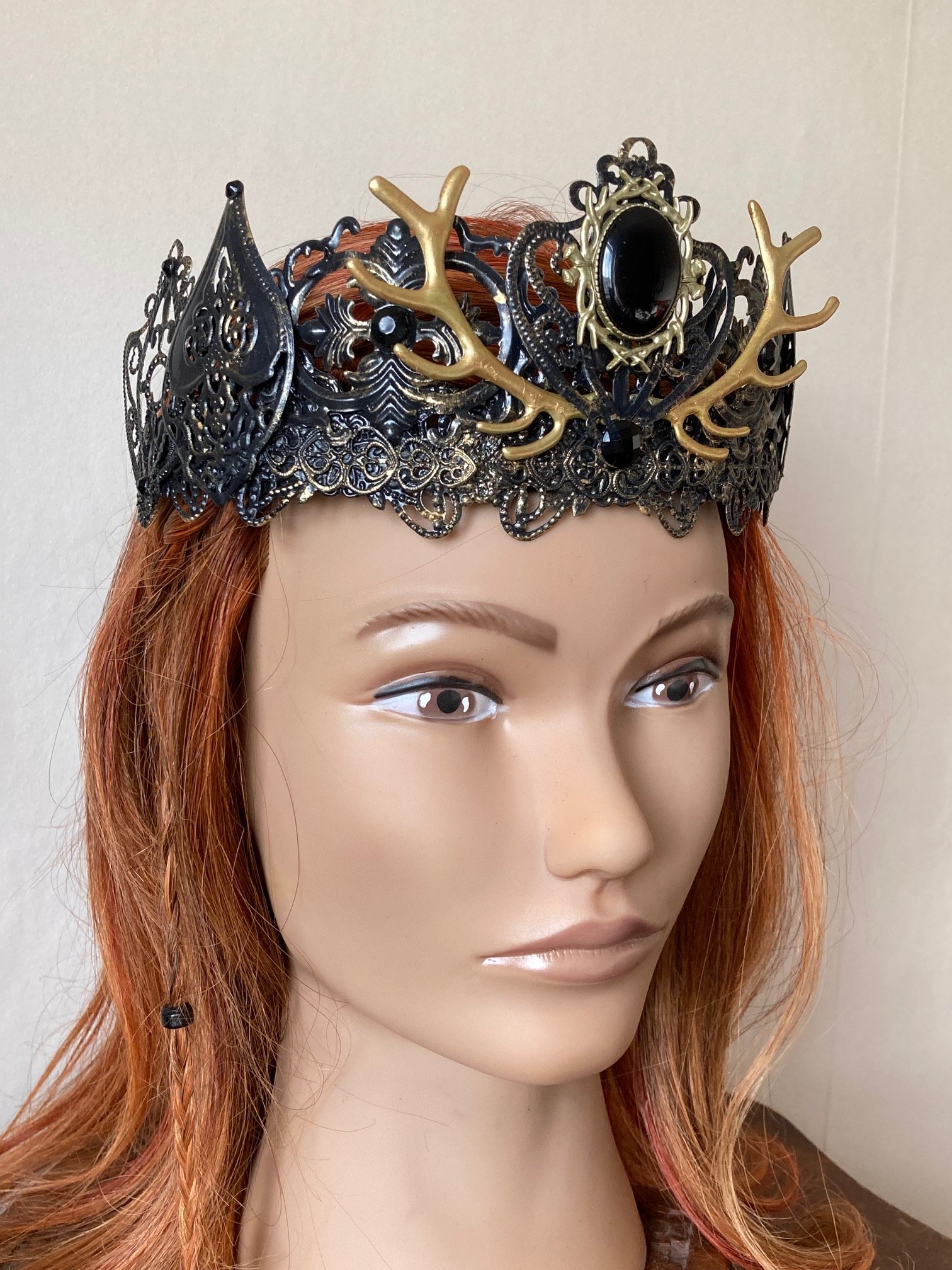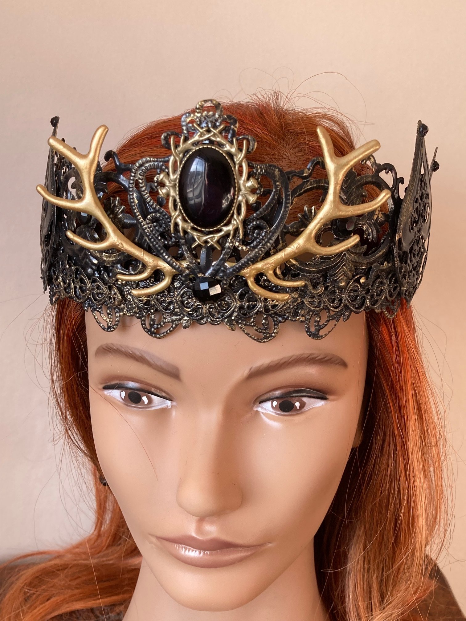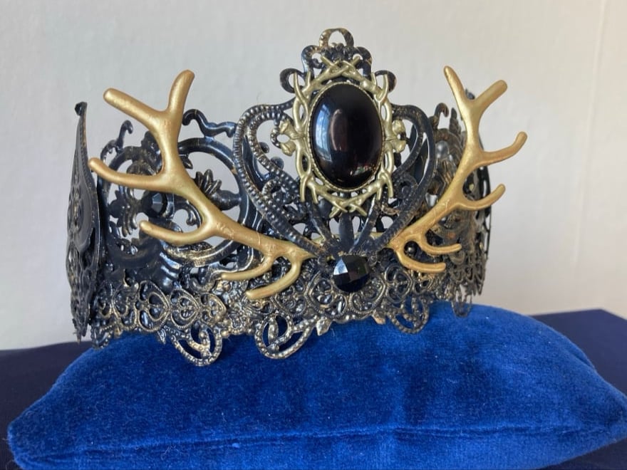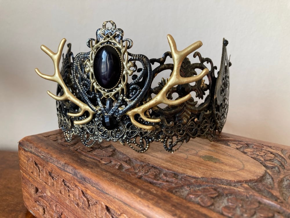In black with dramatic golden antlers and a deep dark black gem, this crown is bold and deserves the head of a God or Goddess to sit upon.