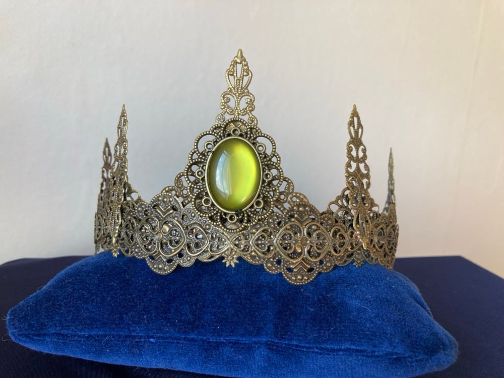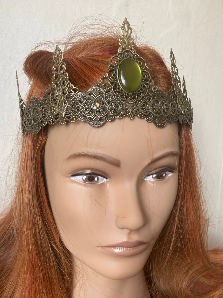 One of our new designs, this is the stunning Elven crown. Made in layers of bronze coloured metals and featuring a gorgeous green central stone, it is perfectly Elven