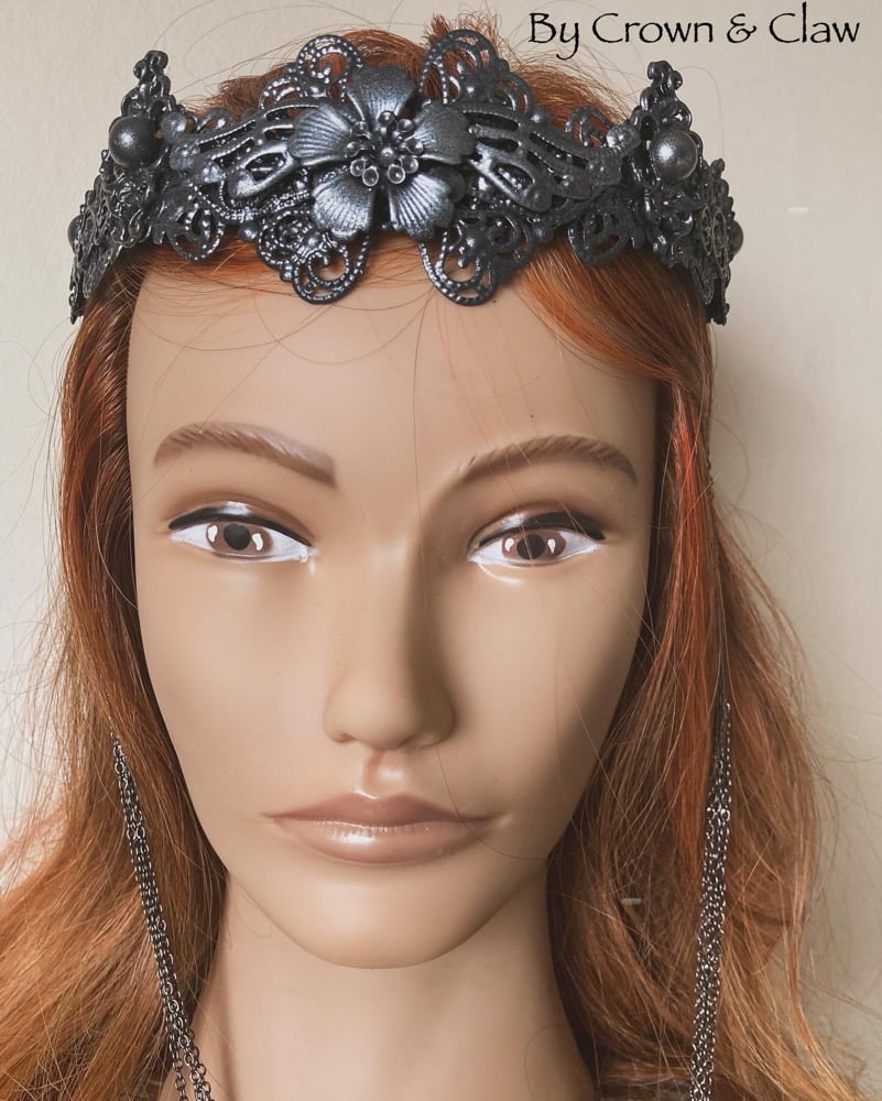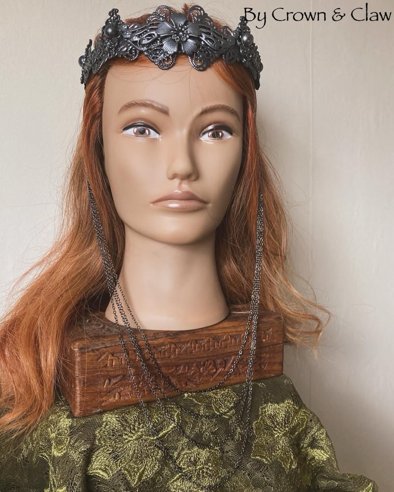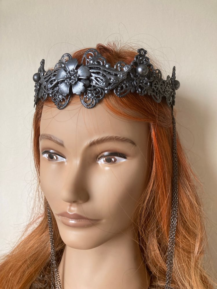 Our stunning Evelyn crown got an upgrade with these delicate lightweight chains. Designed for the beautiful gunmetal colour crown to sit on your forehead, the chains will gently fall onto your chest.