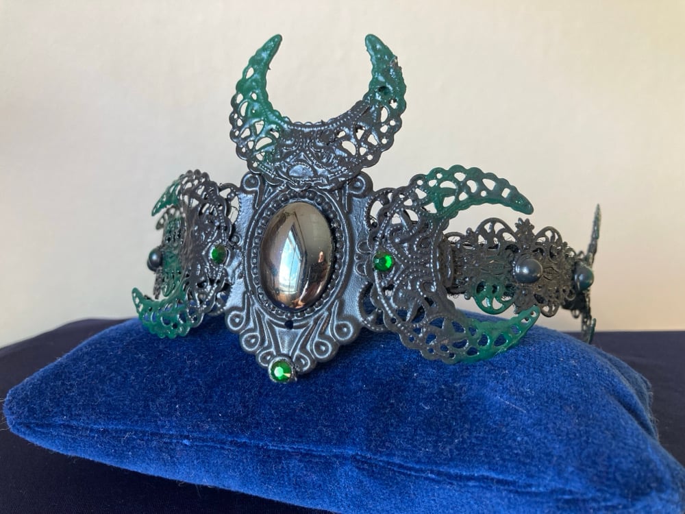 The Hecate crown, but made in black with green tips to the moons and a sprinkle of green gems.