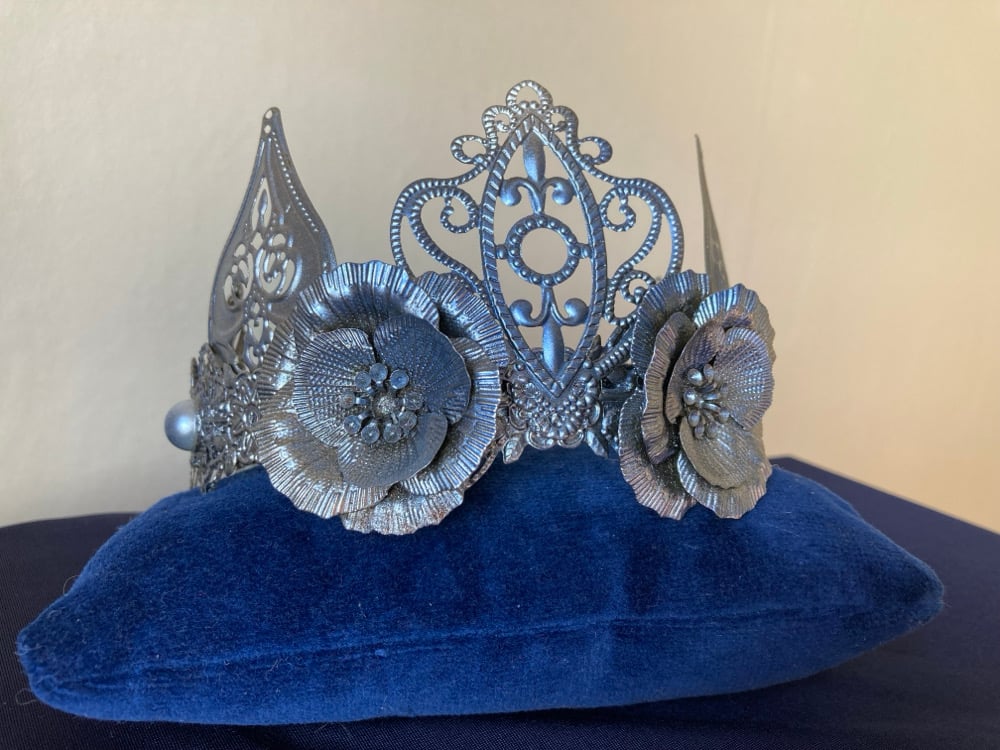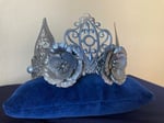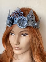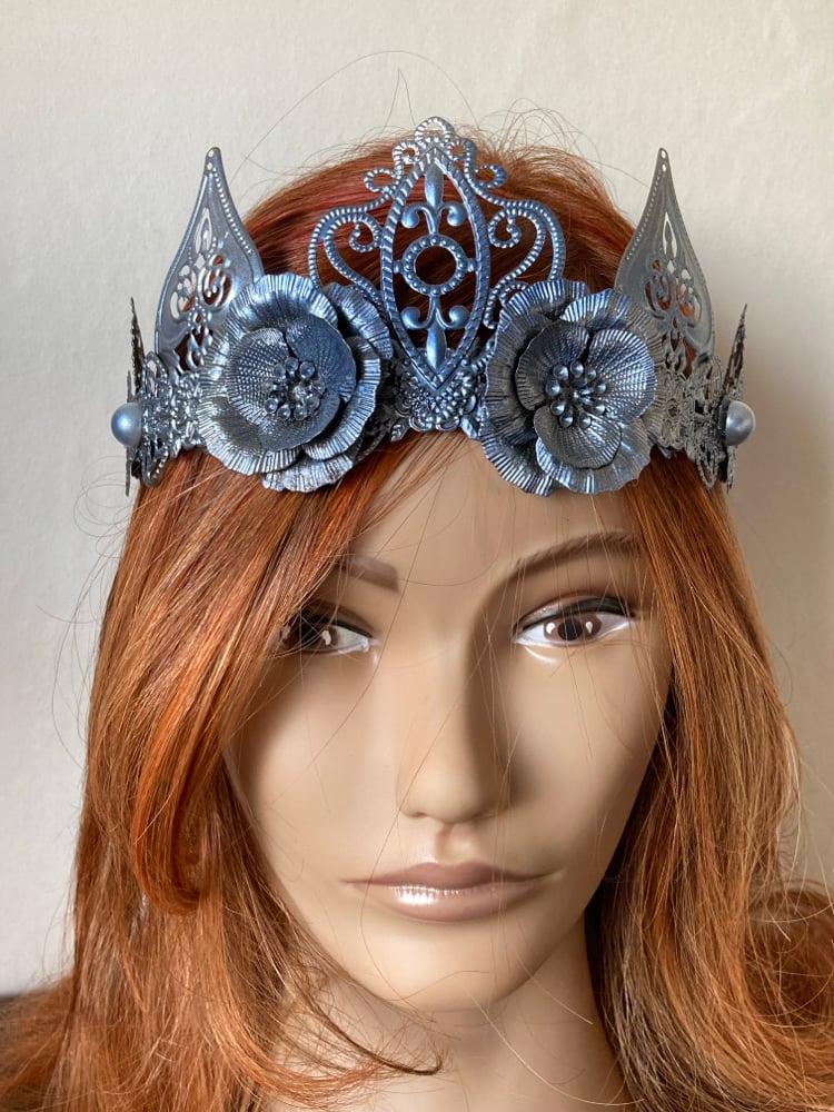 Our ever popular Spires crown with central 'window' framed with twin spires and decorative flowers. This version is in a silvery blue, but it comes in other variants in the Court of Light and Earth